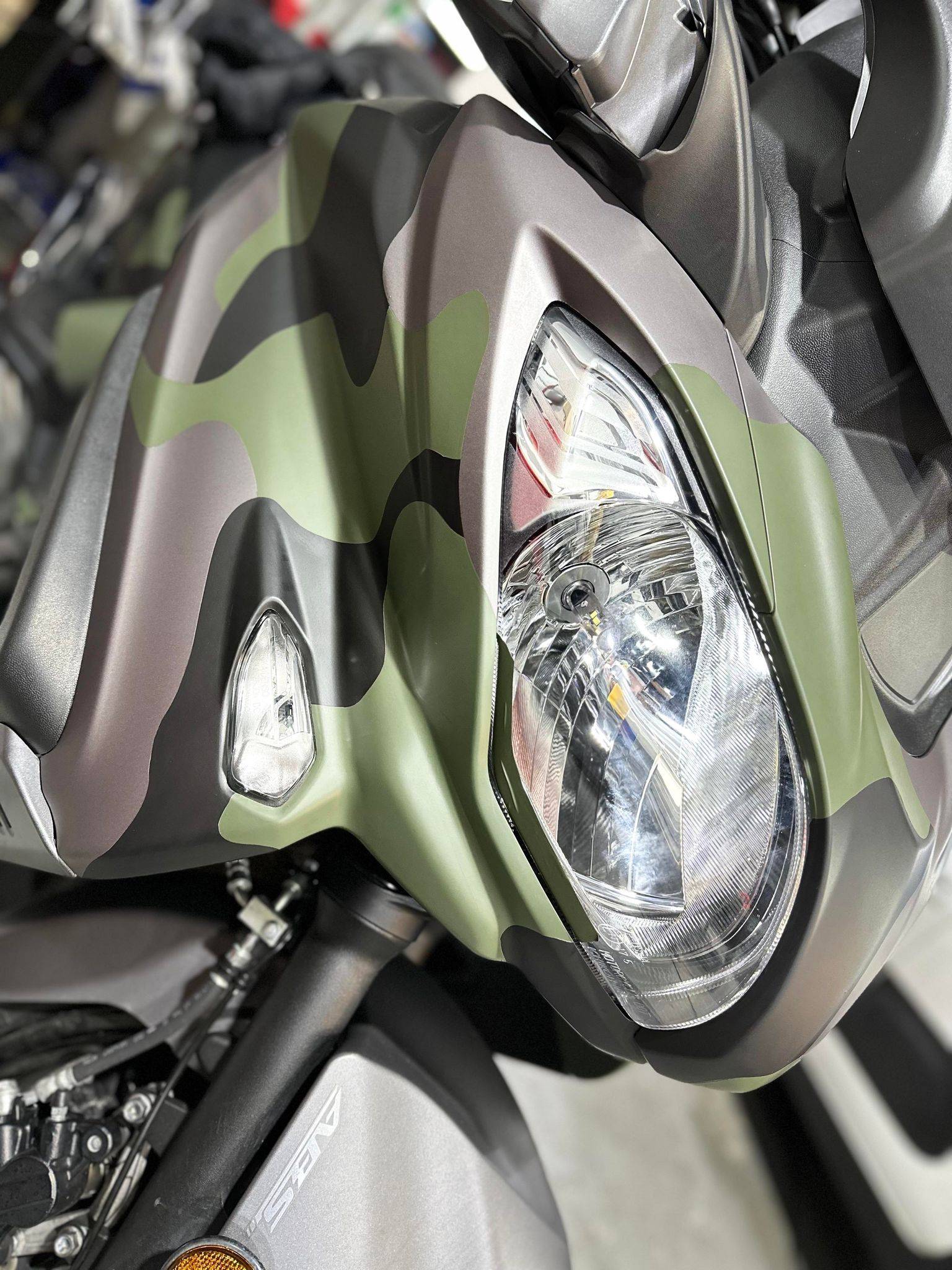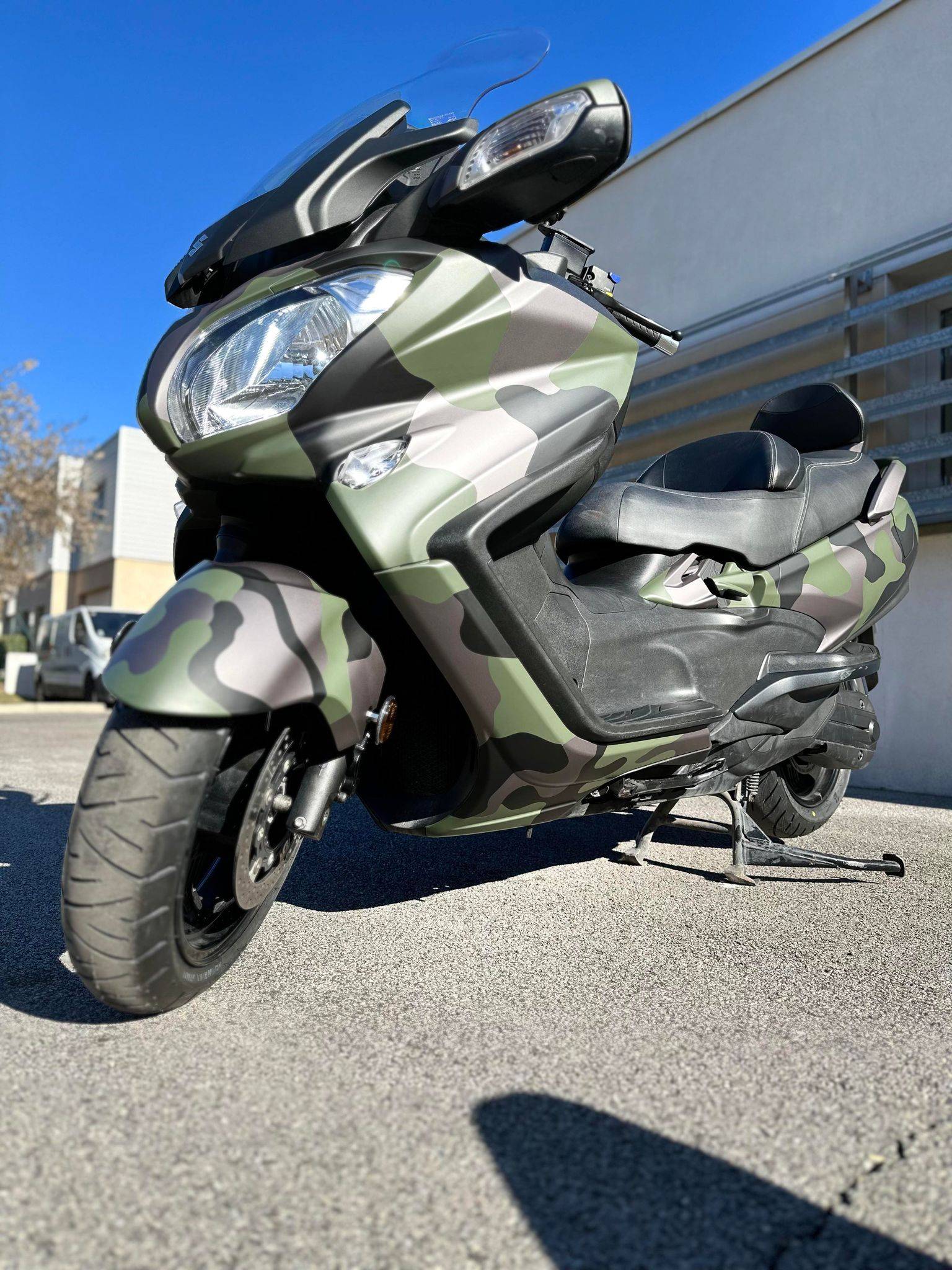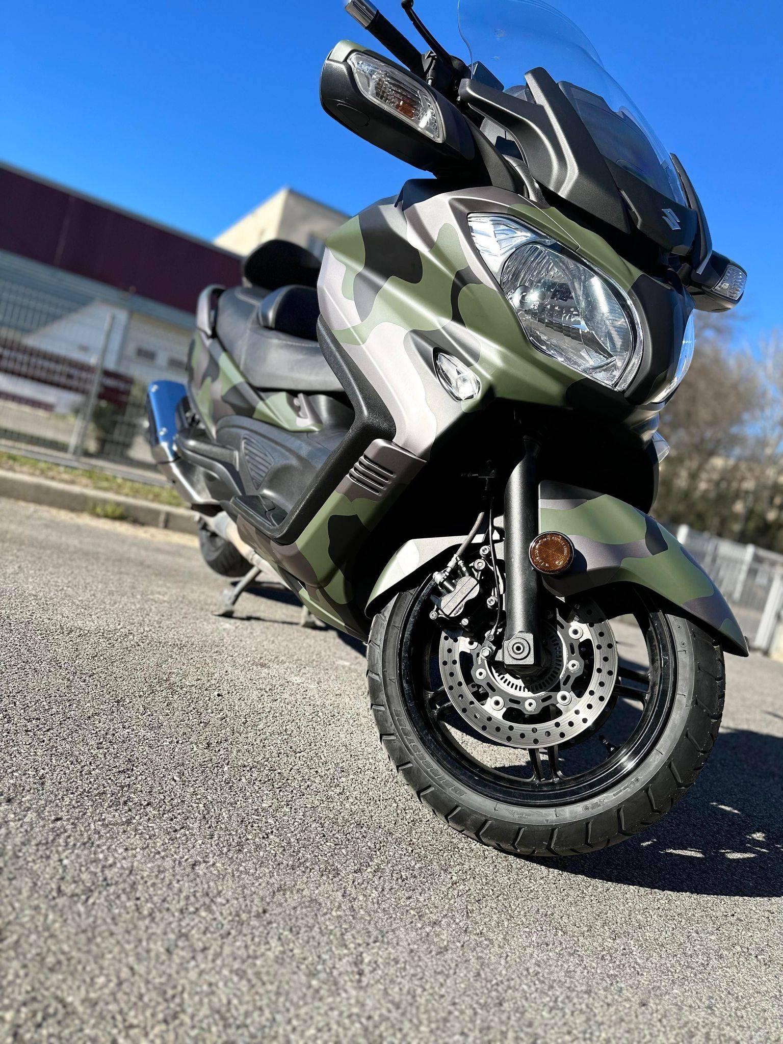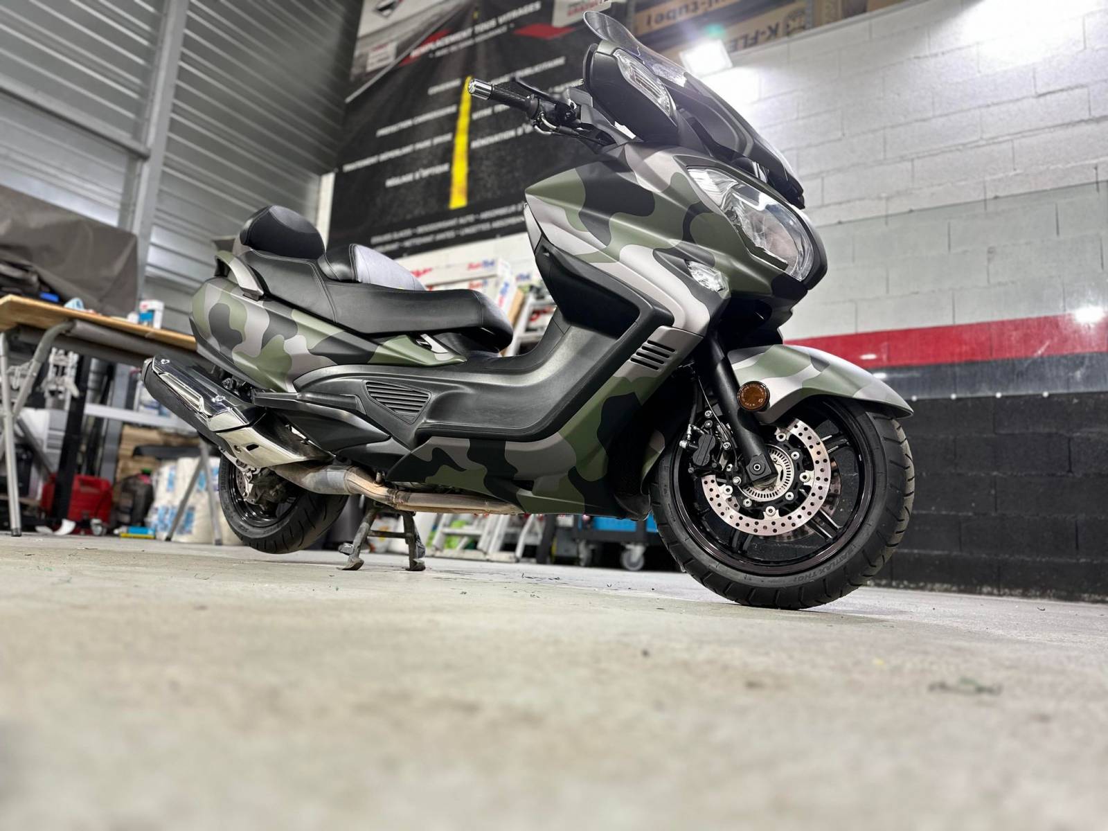 Le client souhaité sur son Suzuki Burgman un camouflage en 3 couleurs, celui ci à était totalement sur mesure, chaque tache à était faite sur mesure.