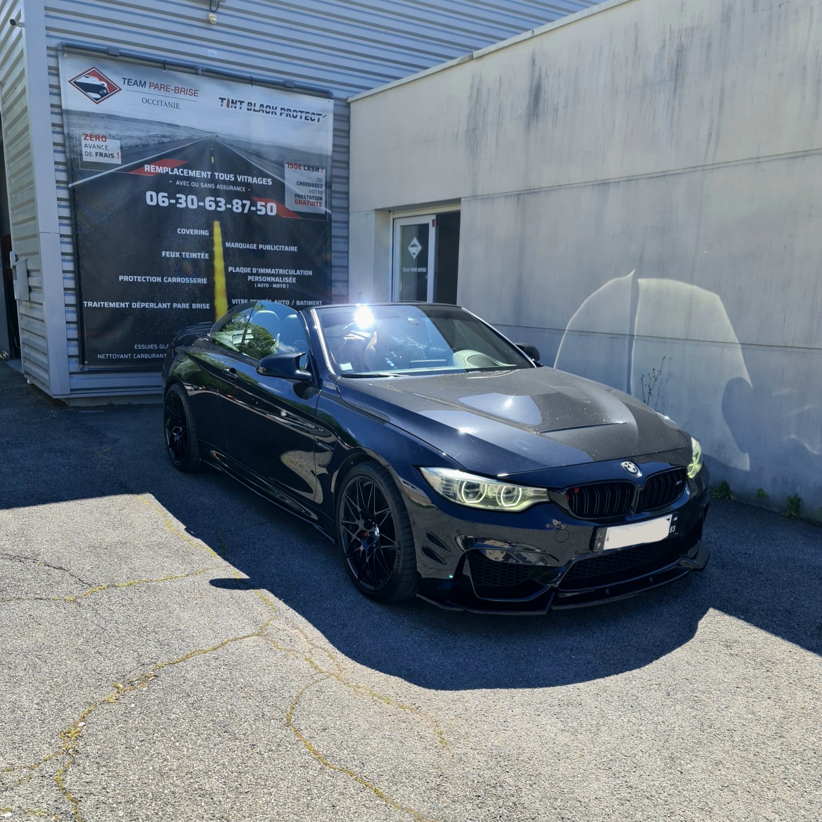 Nous avons récemment effectué la pose de film solaire sur l'intégralité des vitres et le bandeau de pare soleil et de feux teintées avant sur cette Bmw m4 sur la région de Montpellier.